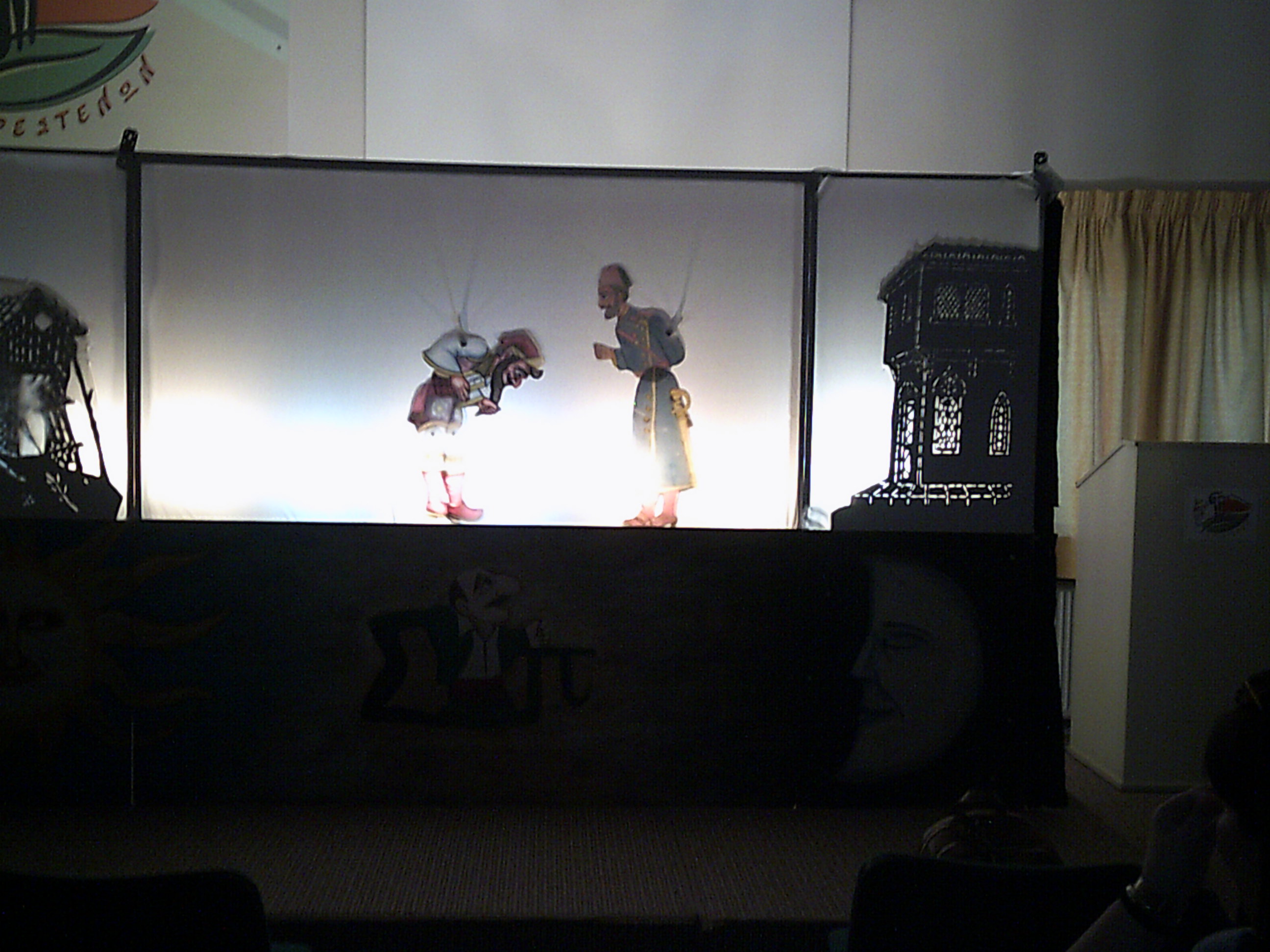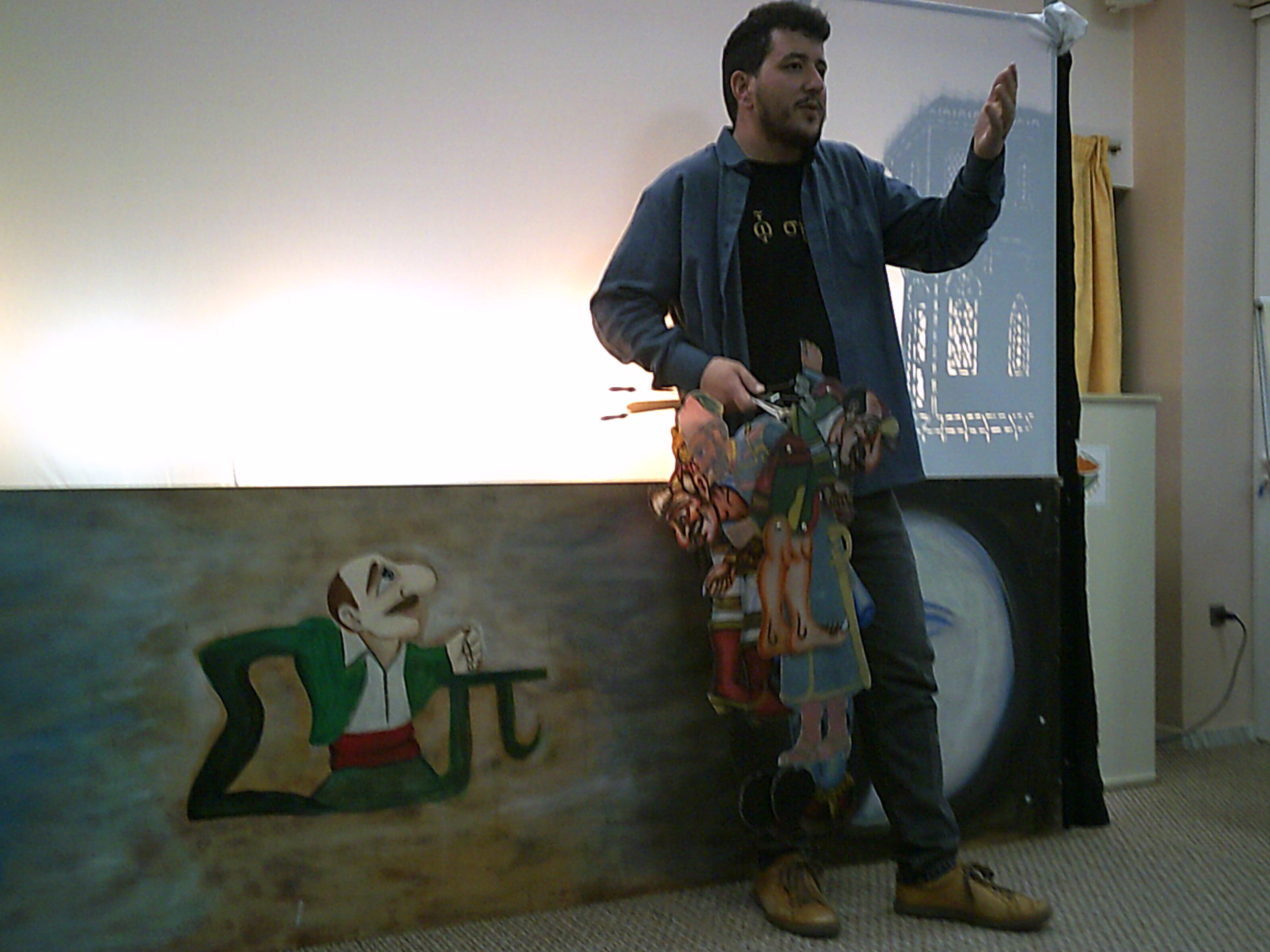 Το απόγευμα του Σαββάτου, πίσω στις εγκαταστάσεις του Κέντρου, υλοποιήθηκε βιωματικό εργαστήριο με τίτλο «Το θέατρο σκιών ως παιδαγωγικό εργαλείο» και συντονιστή τον Στέφανο Παπαγεωργίου, παιδαγωγό και καραγκιοζοπαίχτη. Οι εκπαιδευτικοί, χωρισμένοι σε ομάδες, αξιοποίησαν τις καταγραφές του πρωινού μονοπατιού, δημιούργησαν μικροσενάρια και παρουσίασαν τη δική τους παράσταση με τις φιγούρες του θεάτρου σκιών.