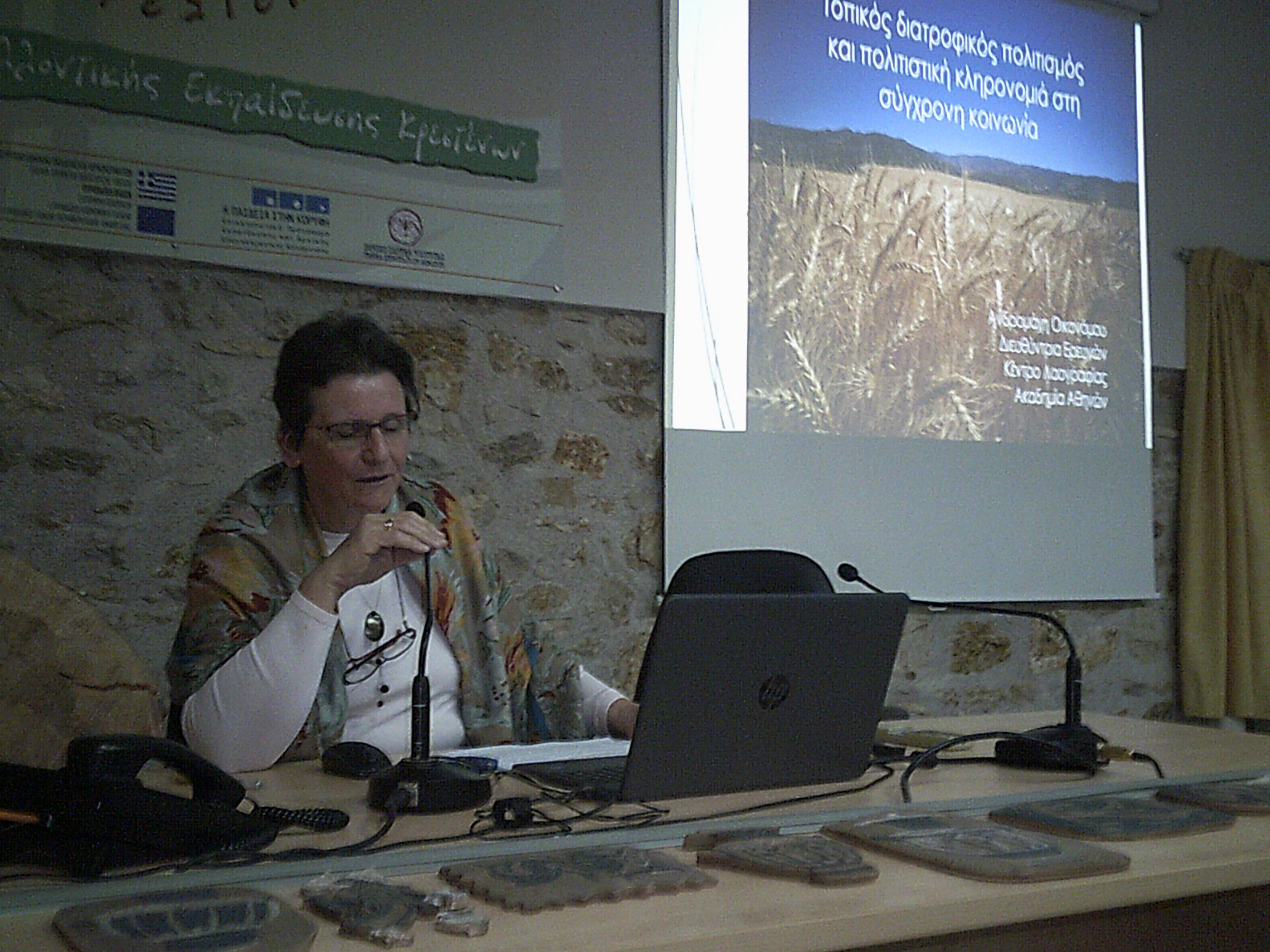 Στη συνέχεια, σε σύνδεση με ηλεκτρονική πλατφόρμα σύσκεψης, η κα Ιωάννα Τζαβάρα από το τμήμα Άυλης Πολιτιστικής Κληρονομιάς της Διεύθυνσης Νεότερης Πολιτιστικής Κληρονομιάς του Υπουργείου Πολιτισμού, παρουσίασε το Εθνικό Ευρετήριο Άυλης Πολιτιστικής Κληρονομιάς της Ελλάδας και τις εγγραφές του που σχετίζονται με την τοπική παραγωγή και τη διατροφή. Ακολούθησε η κα Ανδρομάχη Οικονόμου, Διευθύντρια Ερευνών του Κέντρου Ερεύνης της Ελληνικής Λαογραφίας της Ακαδημίας Αθηνών, που ανέπτυξε τη διασύνδεση του τοπικού διατροφικού πολιτισμού με την πολιτιστική κληρονομιά.